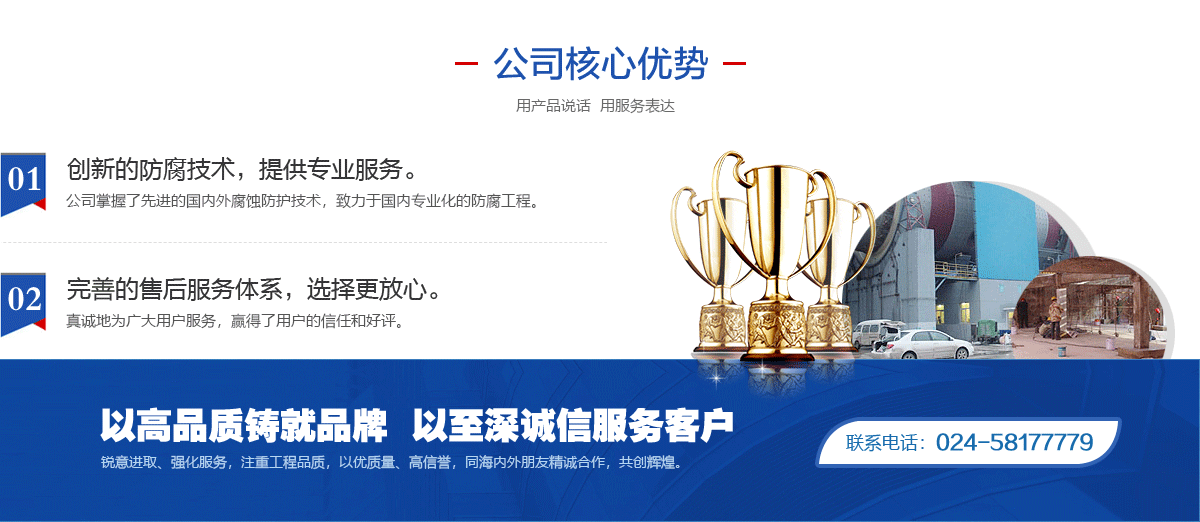 2004;GB/T28001-2011/OHSAS18001:2007;GB/T19001-2008/ISO9001:2008認(rèn)證 體系,取得了化工防腐蝕施工資質(zhì)等級(jí)一級(jí)單位,遼寧省腐蝕與防護(hù)學(xué)會(huì)防腐施工專業(yè)委員 會(huì)主任委員會(huì)主任委員單位,是中國石油撫順石油化工公司網(wǎng)內(nèi)成員單位。幾年來本著“客 戶為尊、精益求精”的服務(wù)宗旨,服務(wù)于基礎(chǔ)設(shè)施、石油、化工、治金、化纖、能源、礦山、 核電站、海洋工程等眾多行業(yè)企業(yè)。 ![]() ![]() ![]() ![]() |